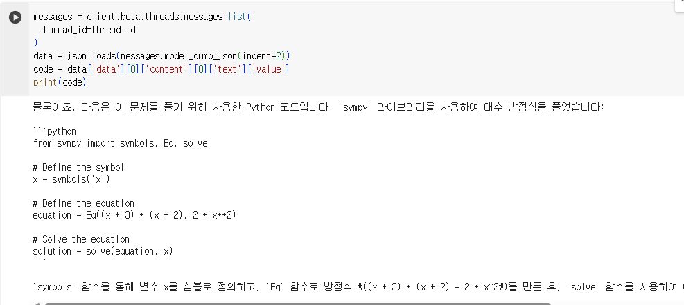 Assistant의 답변을 확인하기 위해서 Thread에서 message list를 가져옵니다.