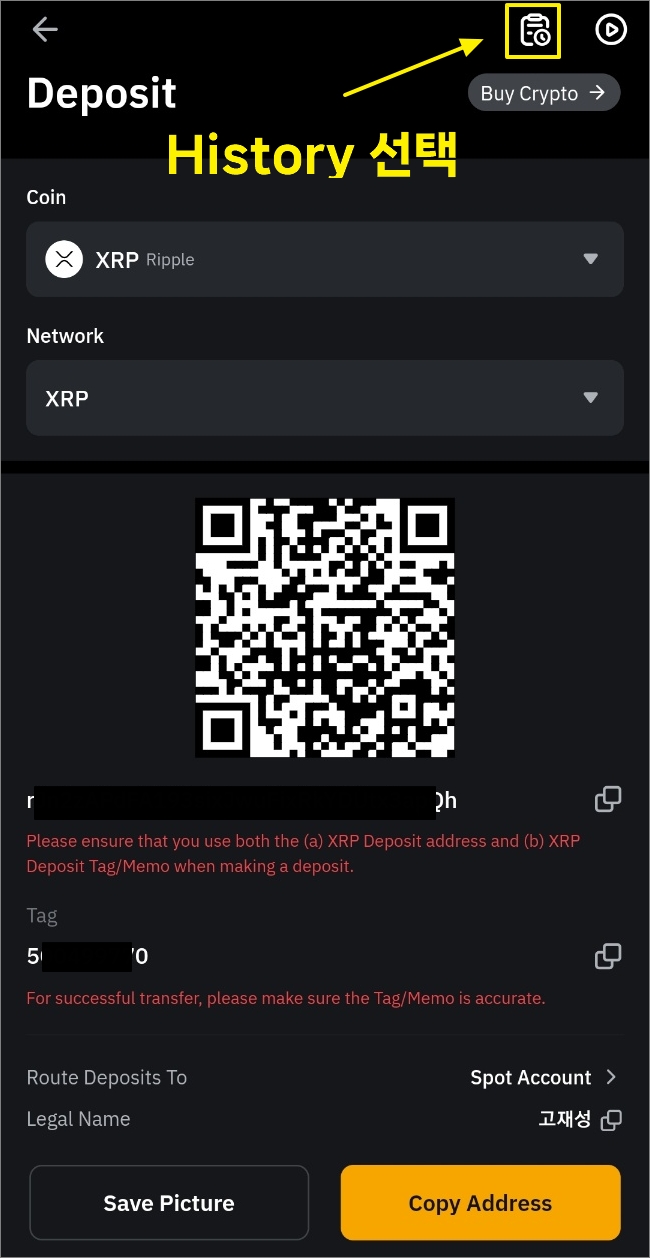 하단의 'XRP 예금 주소'와 'XRP Tag' 를 사용할 수도 있습니다.