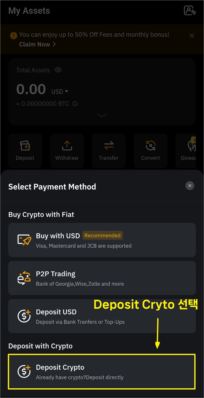 Select Payment Method에서 'Deposit Crypto'를 선택