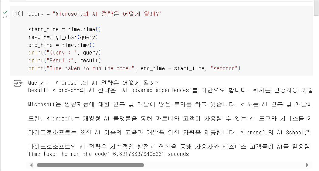 답변의 품질은 제외하고, 답변 양에서는 조금 차이가 있고 답변까지 6.82초 정도 소요되었습니다.