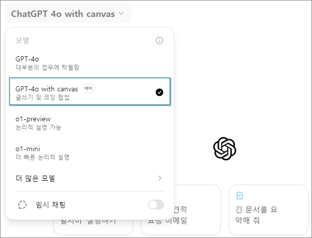 canvas를 사용하기 위해서는 모델 선택 란에서, GPT-4o with canvas를 선택하시면 됩니다.