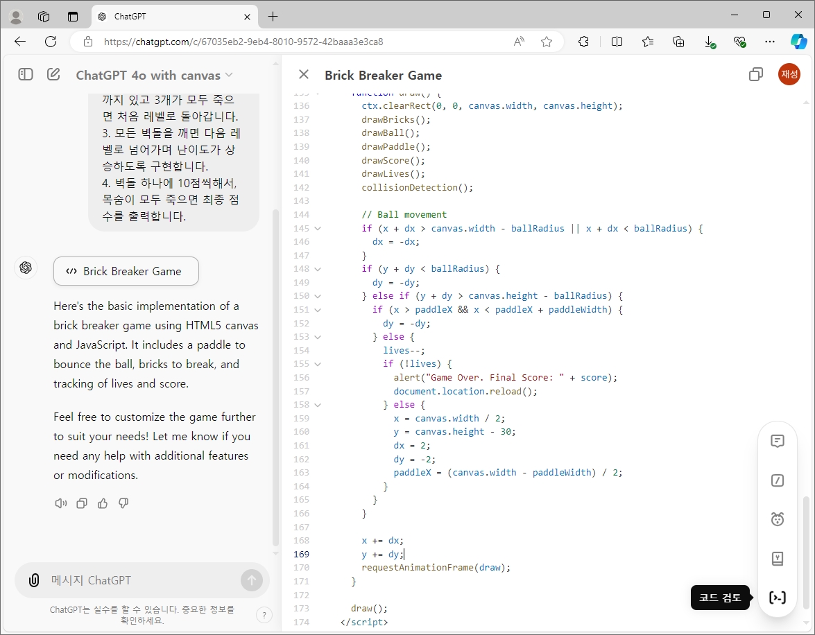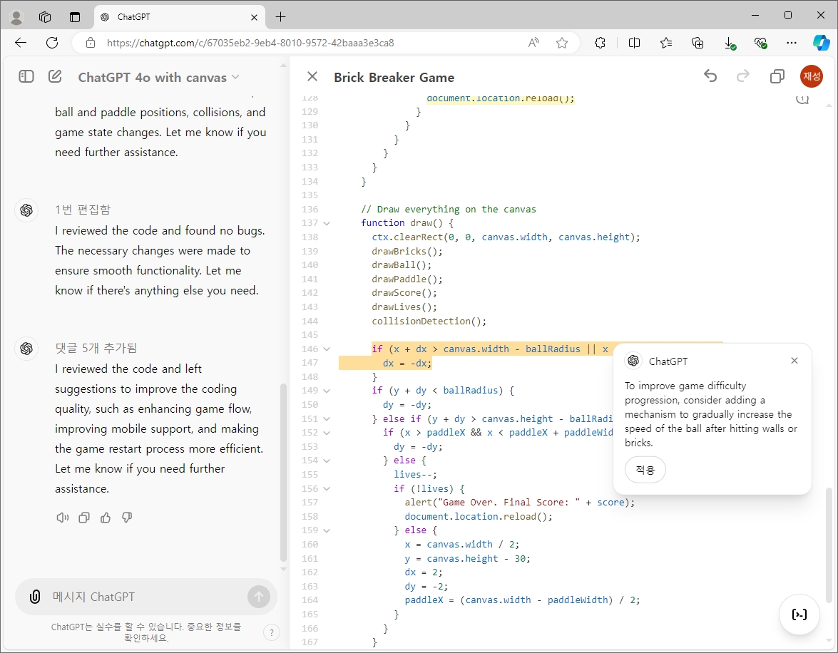 앞에서 보셨을지 모르겠지만, 각각의 canvas 기능을 실행하면 좌측의 프롬프트 창에서 ChatGPT가 수행한 내용에 대한 내용에 대한 답변으로 보내게 됩니다.