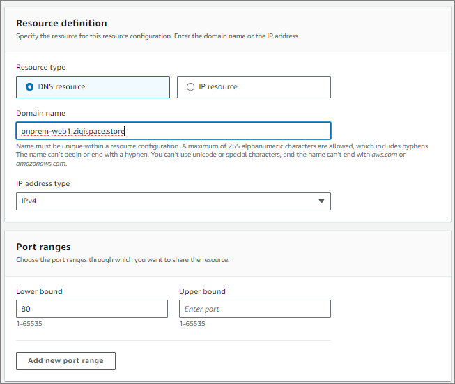 Resource Configuration으로 연결된 Resource가 Site-to-Site VPN으로 구성된 On-Premises의 서버입니다.