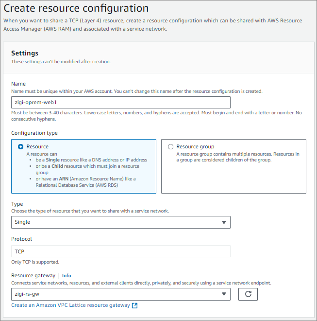 VPC 외부에서 접근이 가능하도록, zigi-rs-gw를 Resource Gateway로 하는
