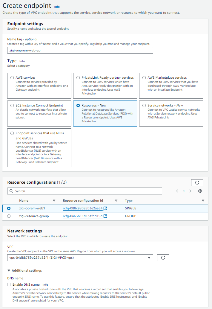 ZIGI-VPC3에서 ZIGI-VPC1의 Resource Gateway를 통해서 On-Premises Web서버로 접근하기 위해