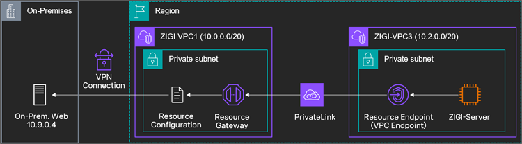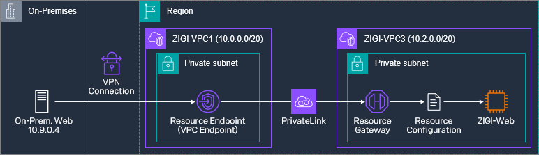 On-Premises의 Web 서버와 접근이 가능한 ZIGI-VPC1에 Resoure Gateway(zigi-rs-gw)를 통해,