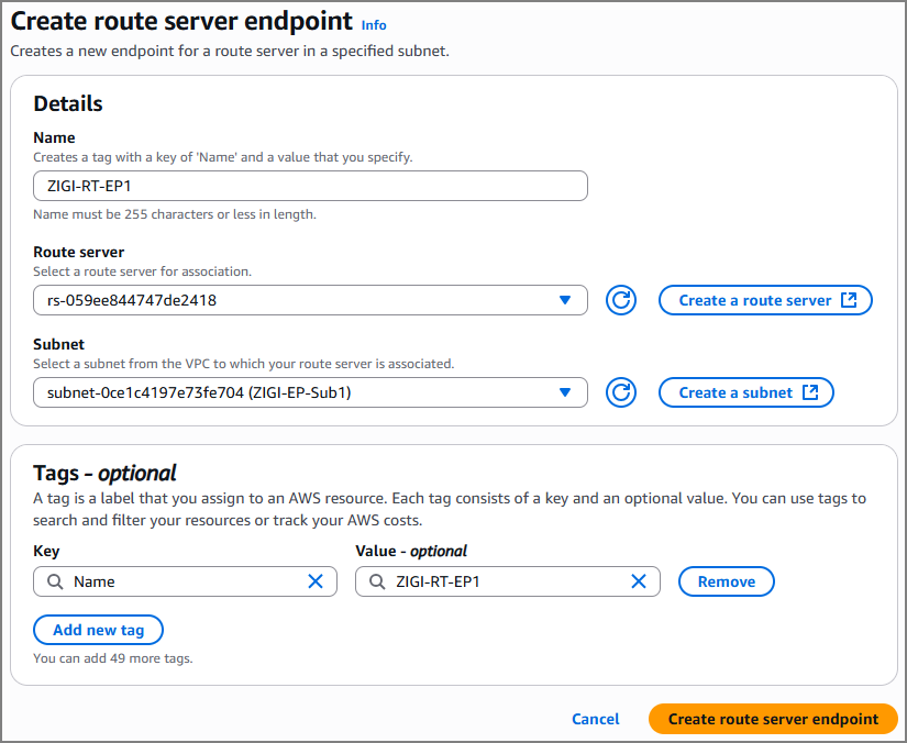 Route Server Endpoint의 이름으로는 ZIGI-RT-EP1으로 하고,