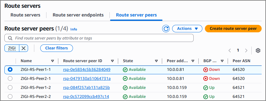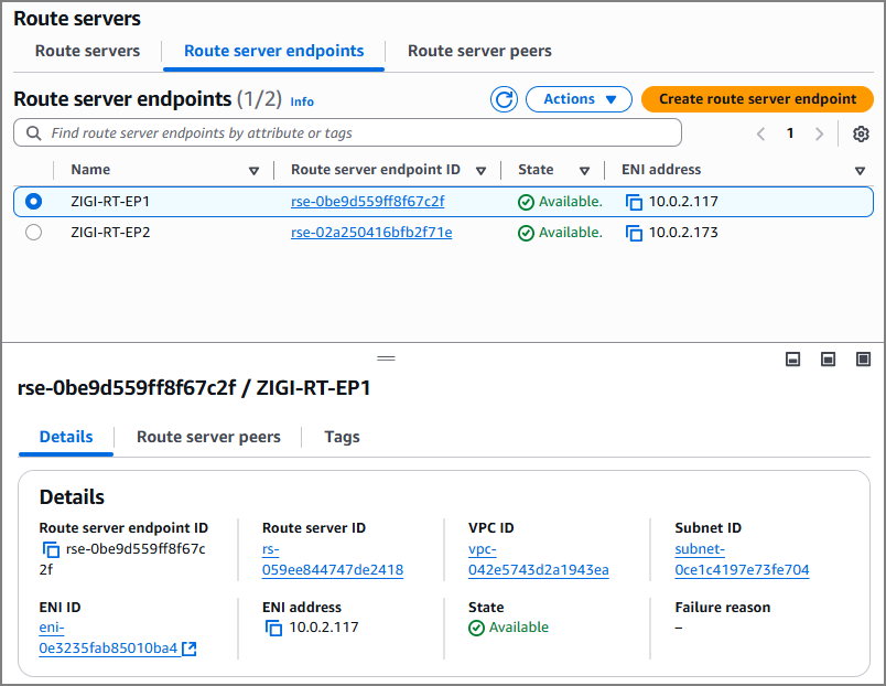 ZIGI-RT라는 이름으로 VPC Route Server가 다음과 같이 생성되었습니다.