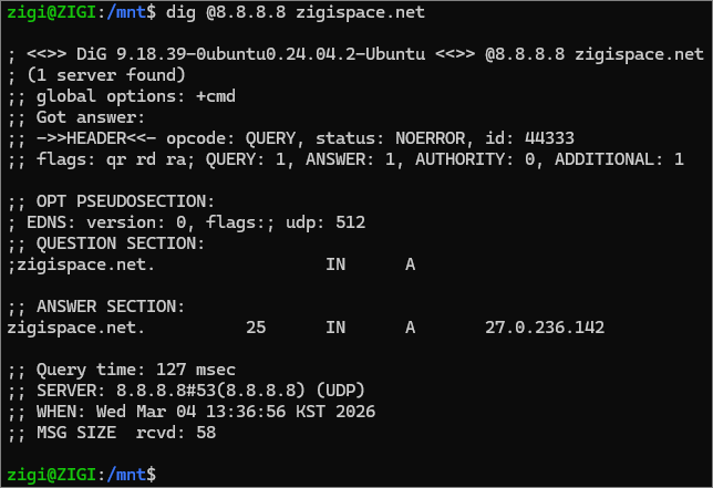 - 도메인 / TTL / 레코드 유형(A) / 레코드 값(IP 주소) 출력 확인