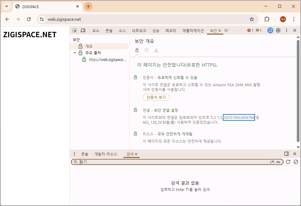 '이 사이트와 연결은 암호화되어 있으며 TLS 1.3, X25519MLKEM768 및 AES_128_GCM을(를) 사용하여 인증되었습니다'